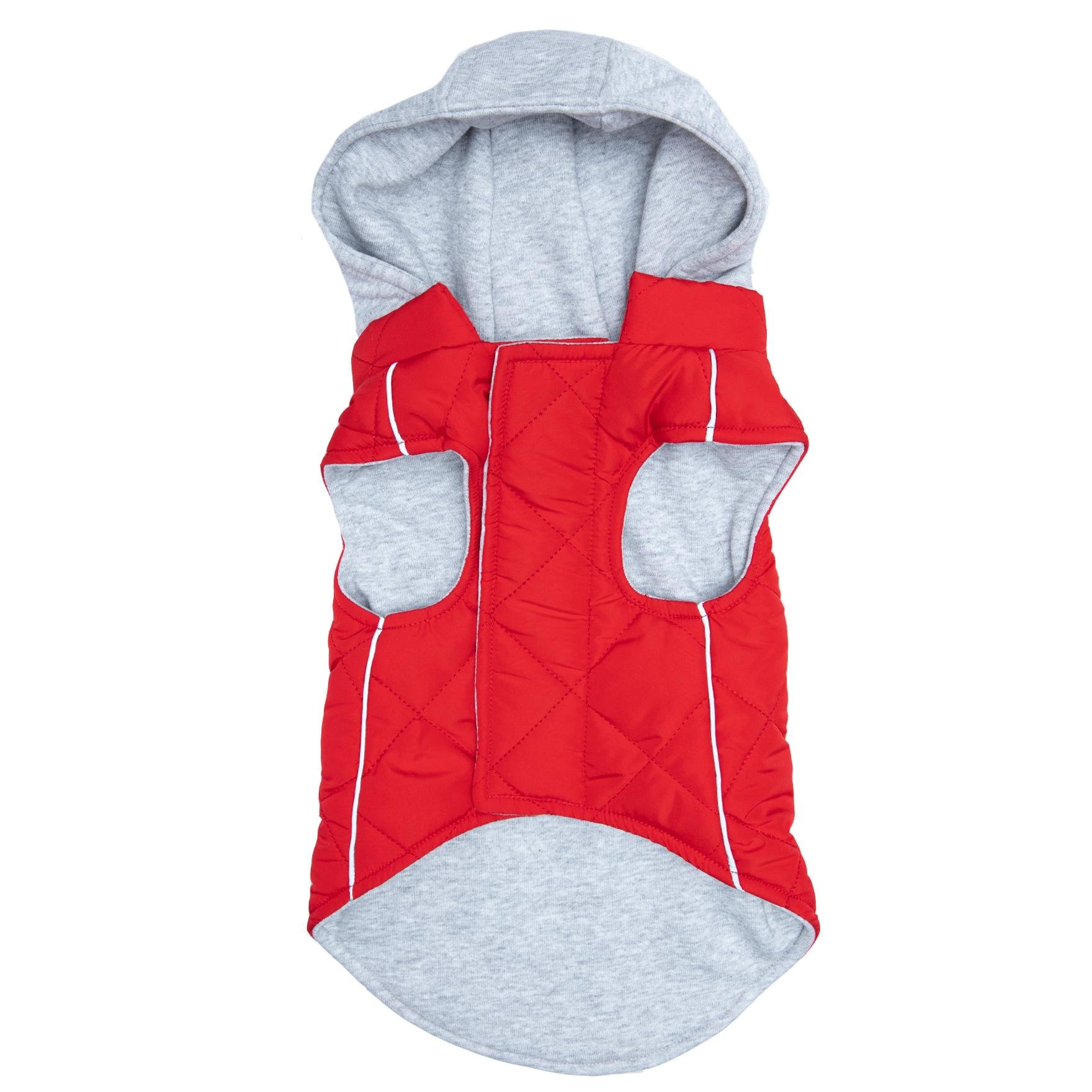 Our quilted Weekender Sweatshirt Hoodies are great for pups on the go! The outer shell is a quilted puffer style while the inner lining is cozy, jersey material. The hood is also made of jersey material and can easily zip off when not needed. Reflective stripping makes your pup noticeable in low light while the two-inch fastener down the chest provides an adjustable closure. Zippered pockets on the back provide a cute finishing detail, as well as an easy place to stash a few treats or a waste bag.